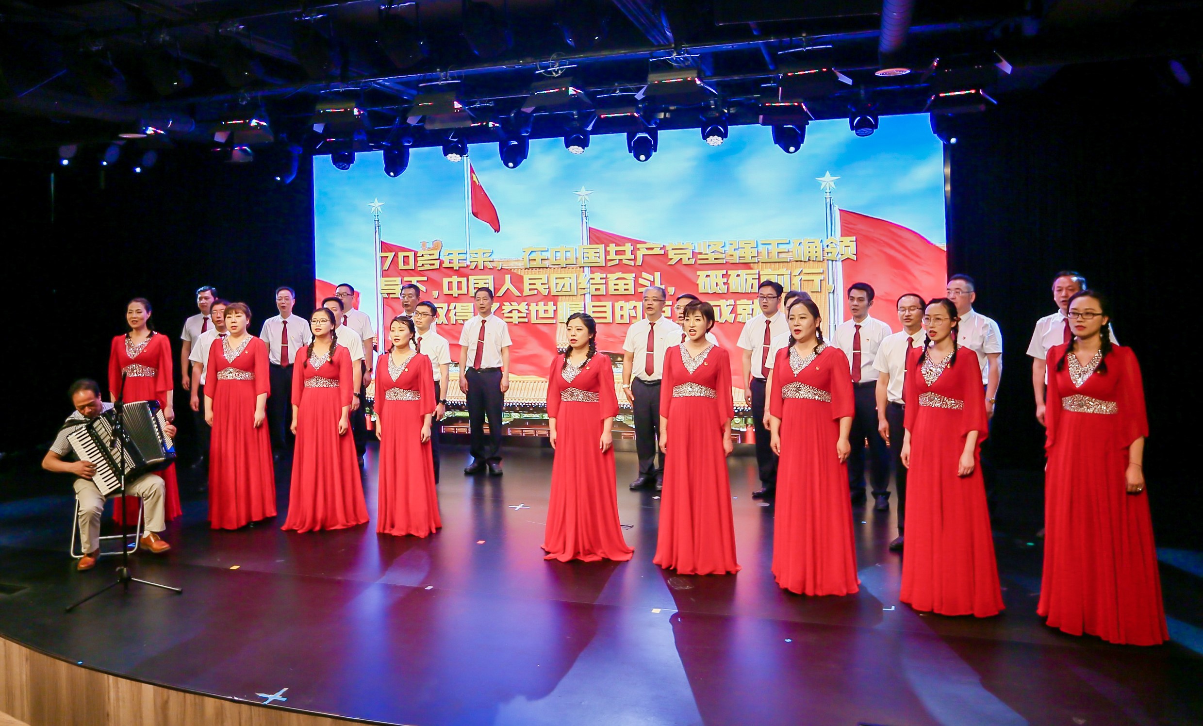 一曲合唱《你是灯塔》拉开了文艺汇演的序幕,以黄慕兰同志曾经在所属经营地块上长期开展地下斗争事迹改编的故事剧《红色传奇在这里写就》、集团三位离退休老干部追忆斗争年代的《听爷爷奶奶讲革命故事》、团员青年的原创歌曲《初心不忘》等特色节目,再现了先辈们的革命精神和崇高风范;歌曲《我的中国心》、《红色娘子军连歌》、《我们都是追梦人》、《在灿烂的阳光下》、《红旗飘飘》、《新的天地》,朗诵《驻足回望,迈向远方》、《火红的七月》、《永远跟党走》、《我的祖国》,舞蹈《打靶归来》等节目相继登场,为党的生日献上最真挚的祝福,不断将演出推向高潮;荣获百联集团2020—2021年度“两优一先”的组织代表和个人分别上台作事迹宣讲,努力营造见贤思齐、对标进位、比学赶超的浓厚氛围,为推动构建公司新发展格局提供强大动力。