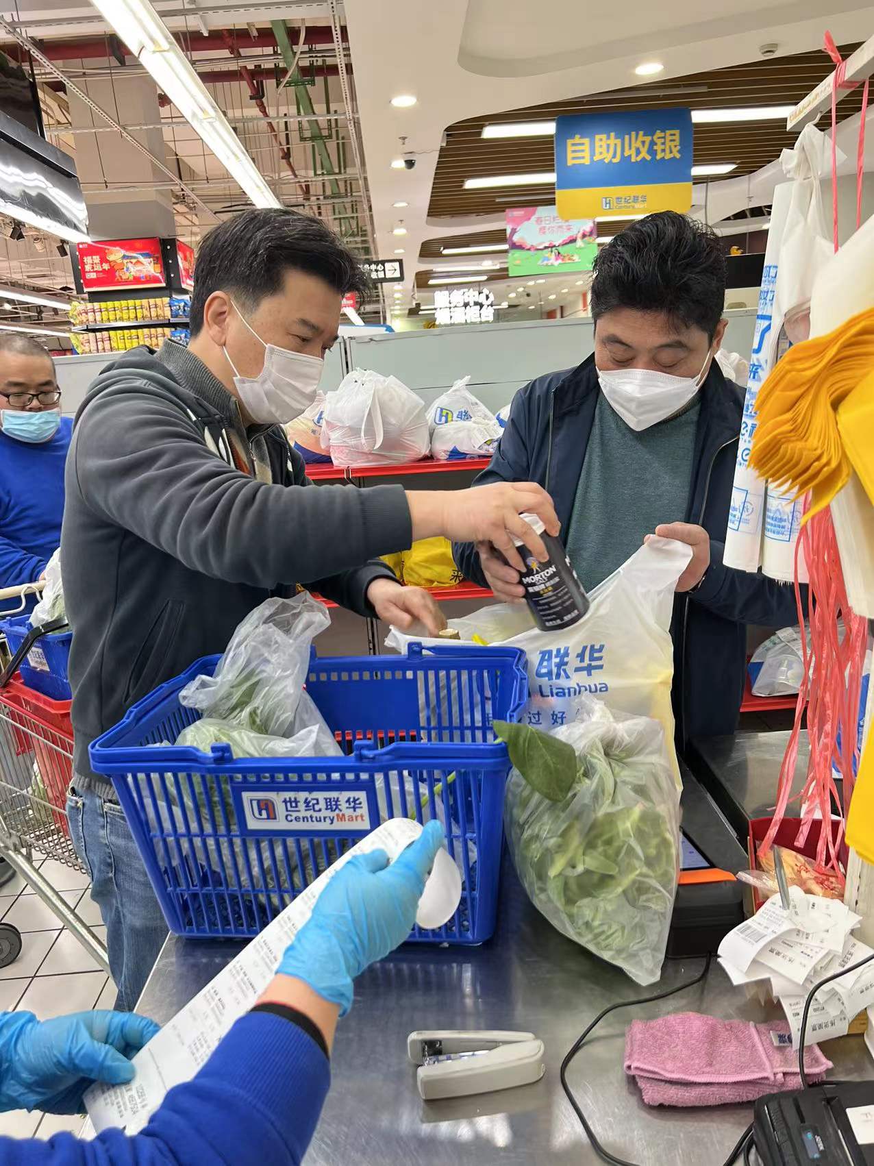志愿者们的到来可谓是雪中送炭。他们有的负责百联到家及各种平台外卖订单的商品复核、装袋;有的引导并协助顾客使用自助买单设备;有的为快递小哥寻找货品核对交接,大家把平时上班的认真钻研劲都用上了,不一会儿那个手持终端RF枪都用得溜溜的,自助收银设备的结算操作流程烂熟于心,耐心细致地回答阿姨妈妈们各种问题,还对外卖订单包裹的摆放规整提出了合理化建议,提高外卖员扎堆取货的效率。三天高强度的工作,虽然身体很累,但大家的内心很充实,纷纷表示能为守“沪”保供尽一份绵力,再辛苦也值!志愿者们的投入和热情,温暖和感染了每一位联华人,临走时东宝店孙店长与陆书记握手言别、真诚致谢:“置业总部的志愿者主动敬业,眼里有活,人人抢着学抢着干,你们来得真及时,帮了我们大忙了!”