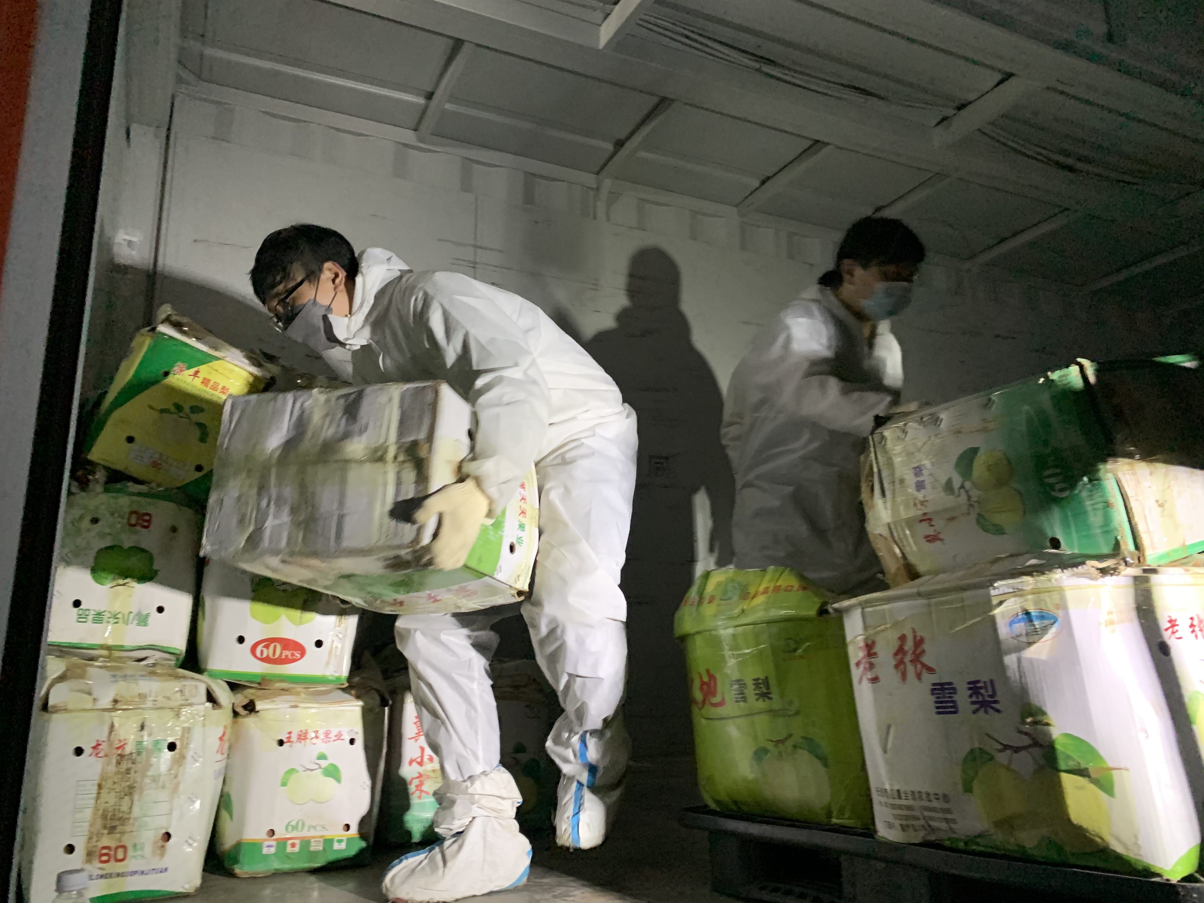 从白天到黄昏,再到深夜,直至次日的凌晨,数不清的蔬果食品被志愿者们靠手搬肩扛的方式从货车上卸下。尽管长时间的重复劳动让人累得腰酸背疼,但大家依旧热情高涨,干劲十足。