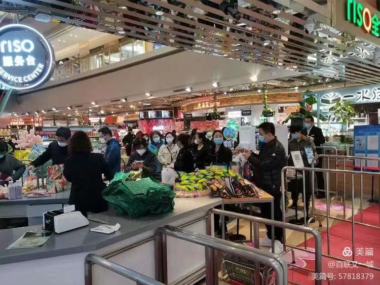 百联又一城购物中心防联控紧急领导小组第一时间启动部署、调整经营时间,并对次日RISO超市可能出现的大客流做好预案,确保经营安全有序。3月28日营业后,许多市民来到超市购买物资。百联又一城党员应急先锋队及部分部室员工迅速出动、支援一线,协助超市维护秩序。通过加设一米线、铁马护栏,合理规划动线,进行人流管控,引导市民有序购买,有效避免人员聚集。