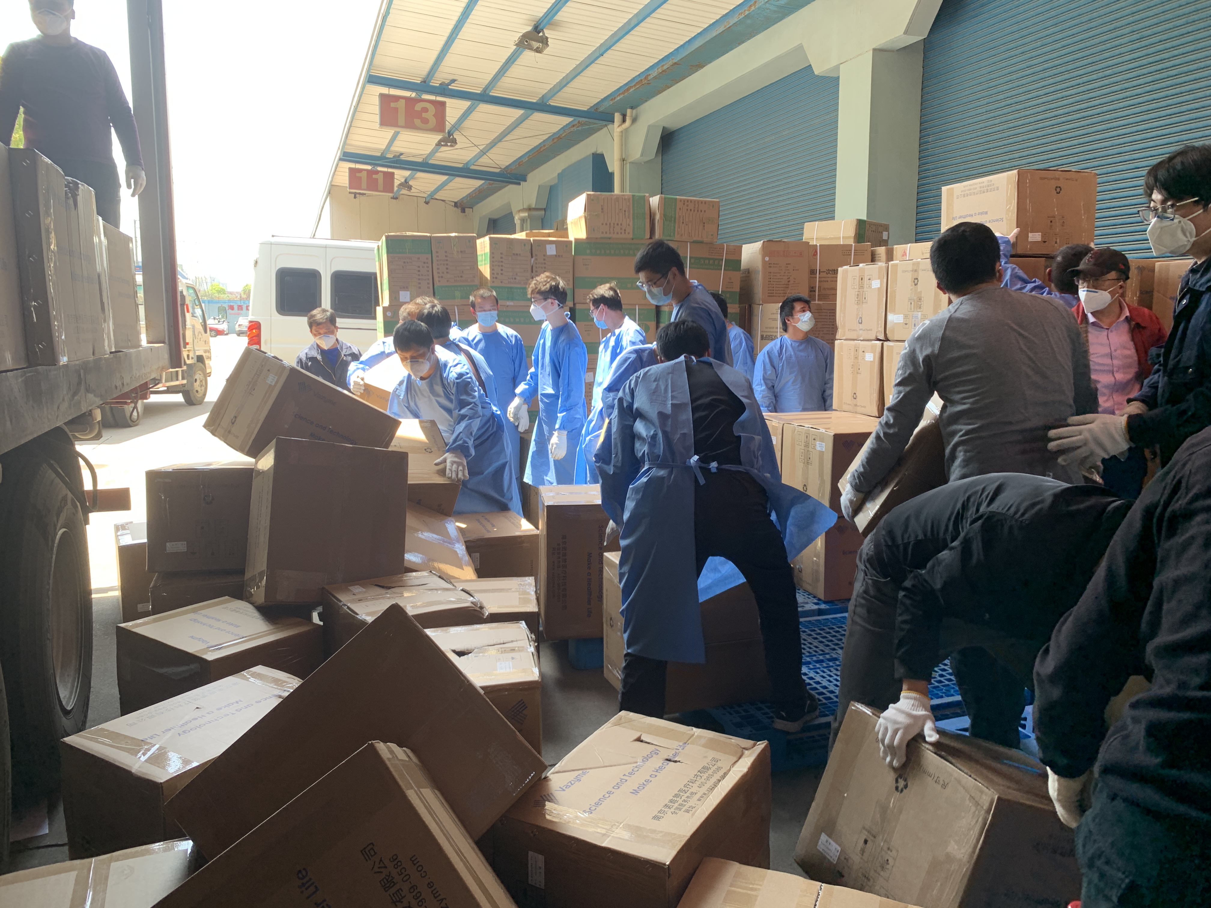 逆风者,向阳而生。当晚8点,首批来自百联汽车的10名志愿者到达物流中心,他们和第一医药的战友们共同搭建了一条搬运“流水线”,在缺少专业工具的条件下,靠着人抬肩扛来装卸,卸货、递货、转交、搬运、入库……每个环节有条不紊。因为他们深知在这防疫物资紧缺的非常时期,手上搬运的是一箱箱医用物资,肩上扛着的却是一股股重于泰山的责任,于是顾不上休息、马不停蹄,熬夜奋战近6个小时,3辆货车共计3000余箱物资顺利卸收。次日上午8点,第二批乾通投资的10名志愿者准时补位,他们以高涨的热情迅速投入作业之中,上午就完成了3辆货车的卸车和2辆货车的装车任务,中午在短暂的休息后又开始了新一轮的接力。截止17点30分,完成了约6000箱医疗物资的装卸和搬运。4月8日凌晨,正当大家还在睡梦中时,百联汽车志愿者们又接到了新的支援任务,不到半小时,又一支16人的志愿者队伍整备待命,6个小时后赶赴华联路。截止发稿时已完成了约2000箱医用物资的卸转装运。
