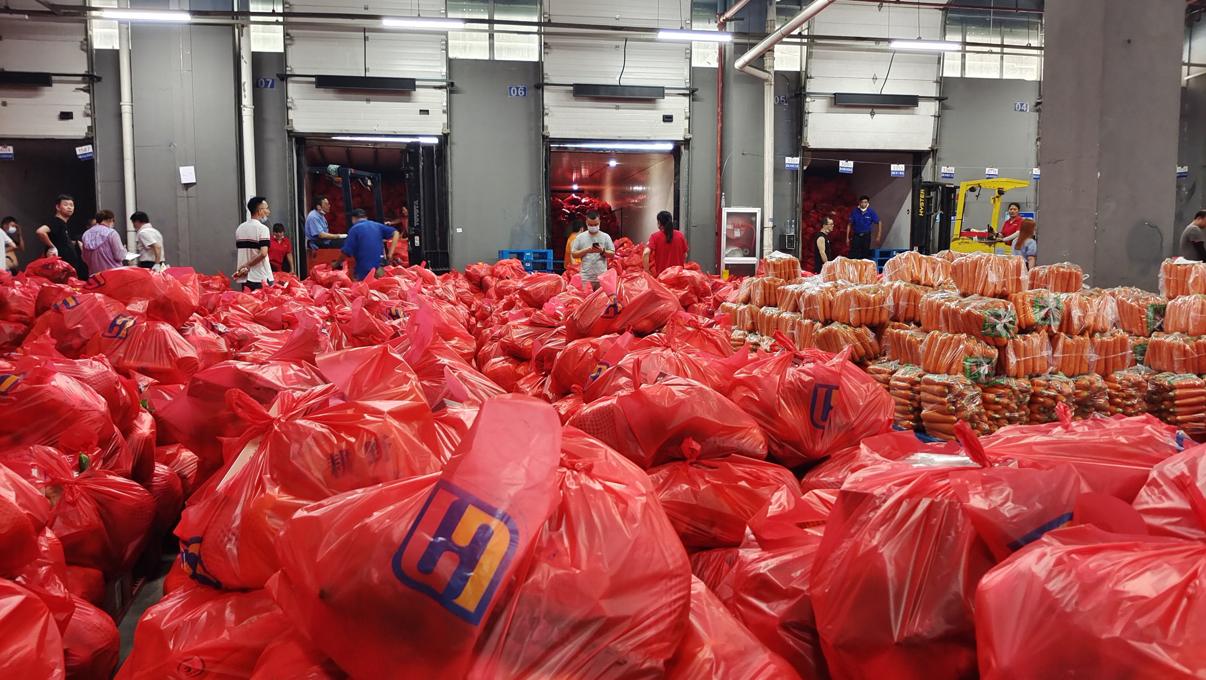 8月3日,义乌发布在全市实施疫情防控临时管控通告。当天晚上8点,义乌市政府发出保供物资紧急需求。作为浙江省生活必需品重点应急响应企业,杭州联华华商集团(下称“浙江联华”)闻令而动,第一时间承接了4.3万份蔬菜、肉品、米、油等民生物资打包配送任务。从8月4日凌晨4点30分至下午4点30分,600余名员工打包作业12小时,按时按需、保质保量将物资送达义乌,圆满完成首次应急保供任务。