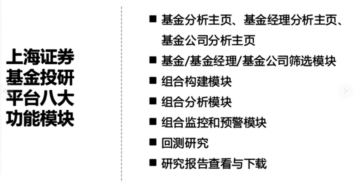 (3)上海证券作为仅有的4家具有基金评价牌照的券商之一,上述所有标签背后都有我们公司专业化的投研分析人员,通过完善的分析方法与验证体系做支持,所以具有:专业设计与验证、动态跟踪与调整、精准修正与复核的特色。