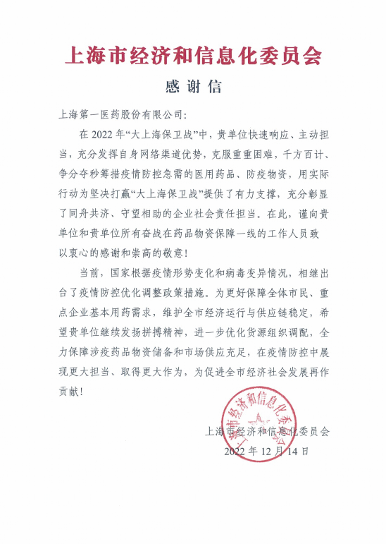 这封338字的感谢信是市经信委对担负2022年“大上海保卫战”保供任务中坚守岗位、辛勤付出的第一医药人最大的鼓舞和激励,是对第一医药服务的高度认可,更是在当前疫情形势不断变化过程中对第一医药提出的新期望!