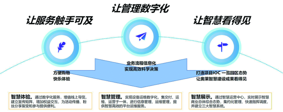 自2019年5月起,项目团队围绕数智奥莱建设,从物业管理、商户服务以及顾客体验三大需求入手,以开放空间、购物体验、智慧管理以及数智场景为四大标签,依托百联自身多年积淀的数字化基底,牵手华为团队,调研各业务线条需求,加速数智化连接与拓展,实现商业零售体验进阶。在2022年9月,完成数智奥莱1.0版打磨,实现“管理数字化、让智慧看得见、让服务触手可及”三个目标。