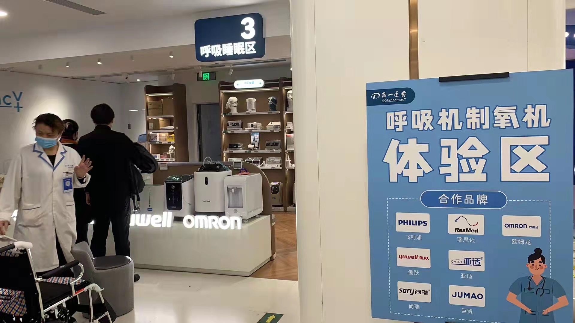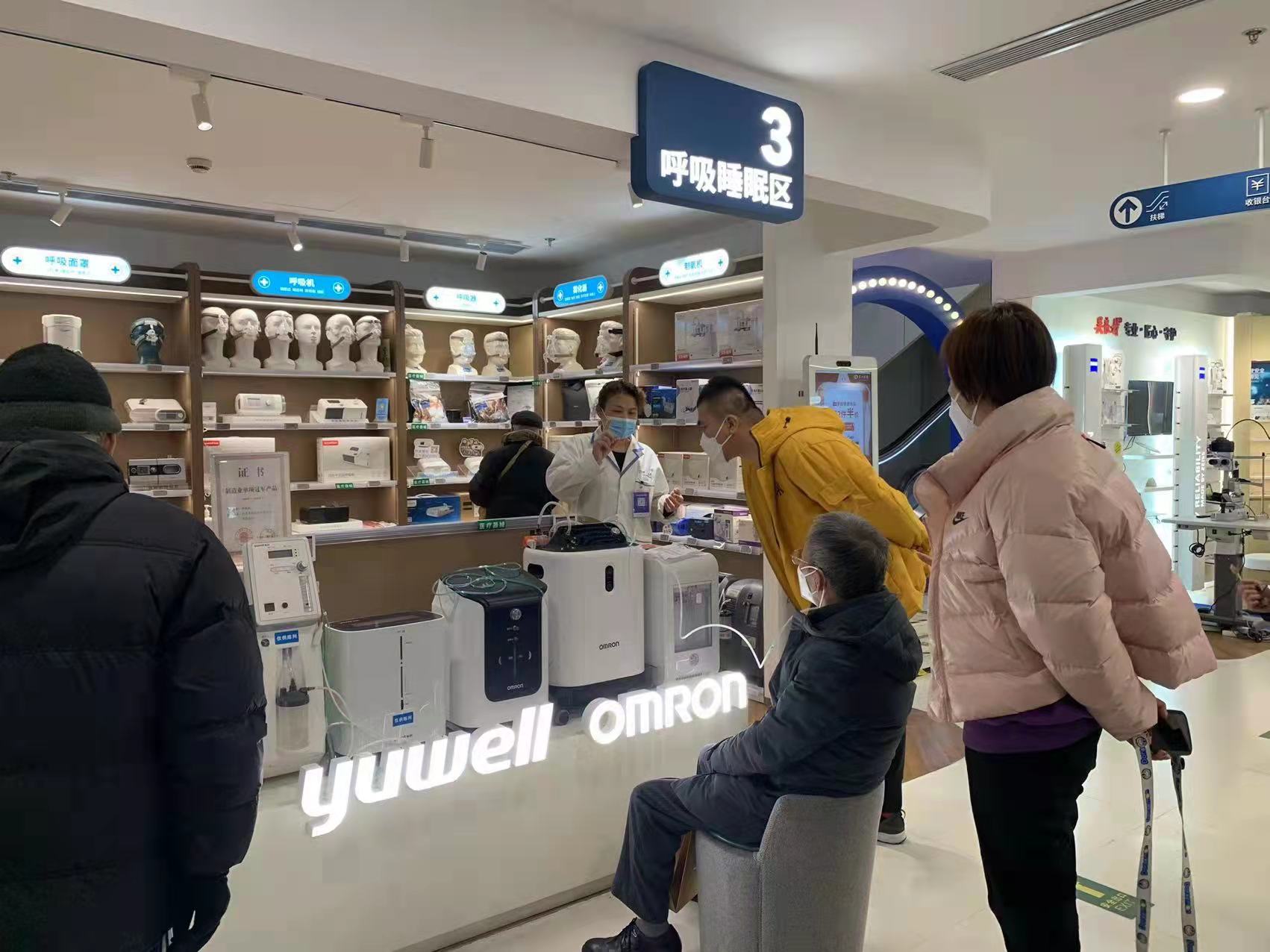 在南京路步行街上第一医药商店三楼器械专区的呼吸睡眠区,一块醒目的“呼吸机制氧机体验区”引人关注。上周末,已有16位市民通过预约模式,前来体验了免费吸氧服务。