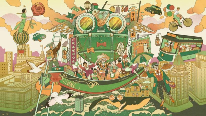 其中,在橱窗展示的《1923,幻镜上海》品牌插画,由插画师张文绮创作,汲取百年品牌灵感,结合经典传统与梦幻想象,将茂昌眼镜百年故事幻化成生动的现代艺术,通过典雅细腻的画风,融合新旧上海元素和典型人物,描绘出一个介于幻想和现实之间的海派风貌,展现了“海派摩登”的茂昌精神。