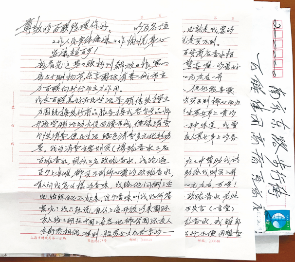 3天前,商业中心总经理办公室收到一封来信,写信者自述已是百岁老人,一直喜欢男用古龙香水的味道,但如今出门不便无法购买,正巧看到5月12日《解放日报》上刊登的百联集团55购物节特刊,整版介绍了百联的一系列营销活动,老人于是萌发了写信到商店寻购香水的念头。