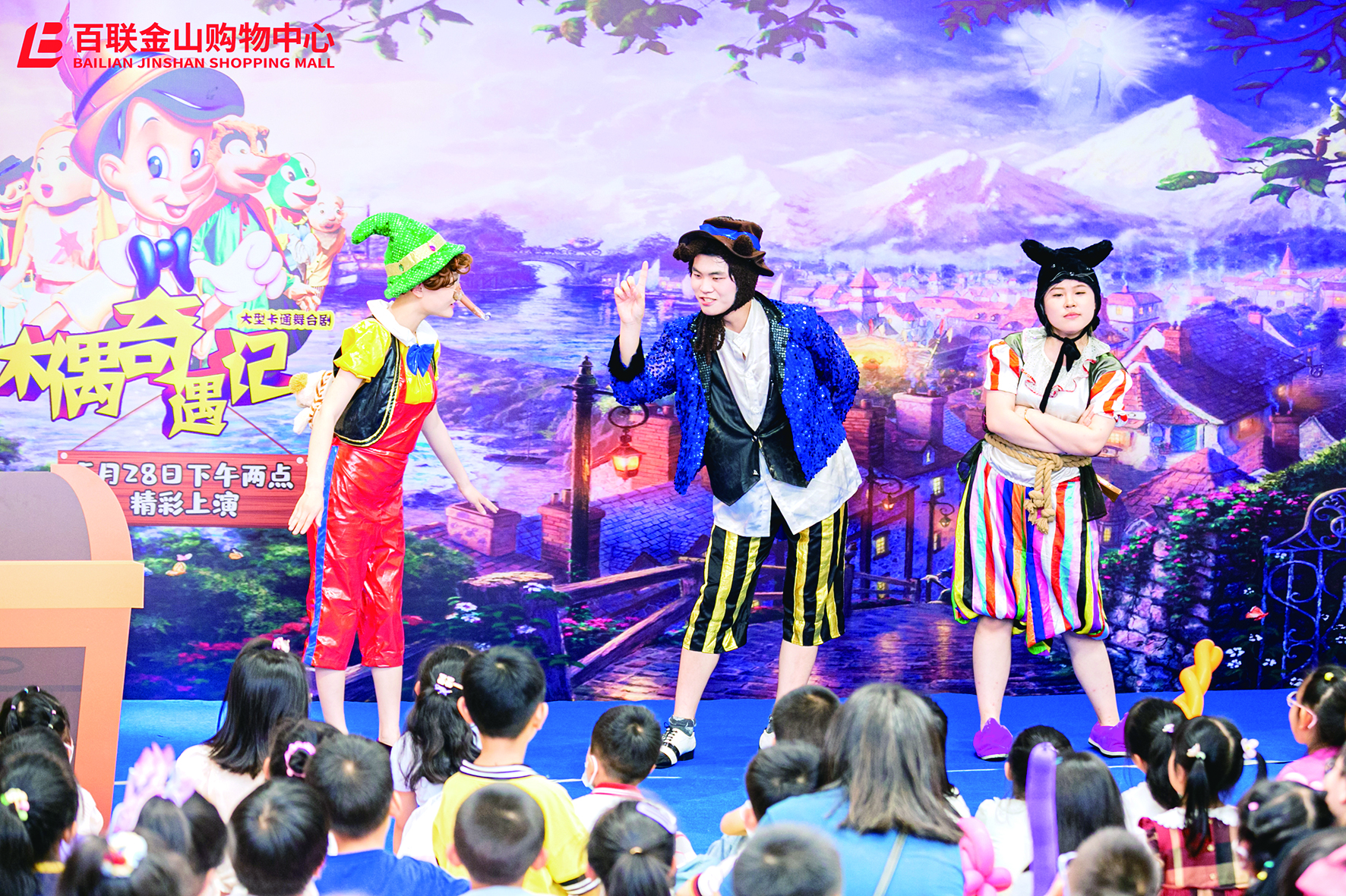 童话剧:随着消费者对情感互动需求的深入,百联金山购物中心亲子场景消费也不断升级,引入童话剧。现场表演的木偶奇遇记,通过互动的形式进行,亲子家庭不仅是旁观者,也是表演的参与者。