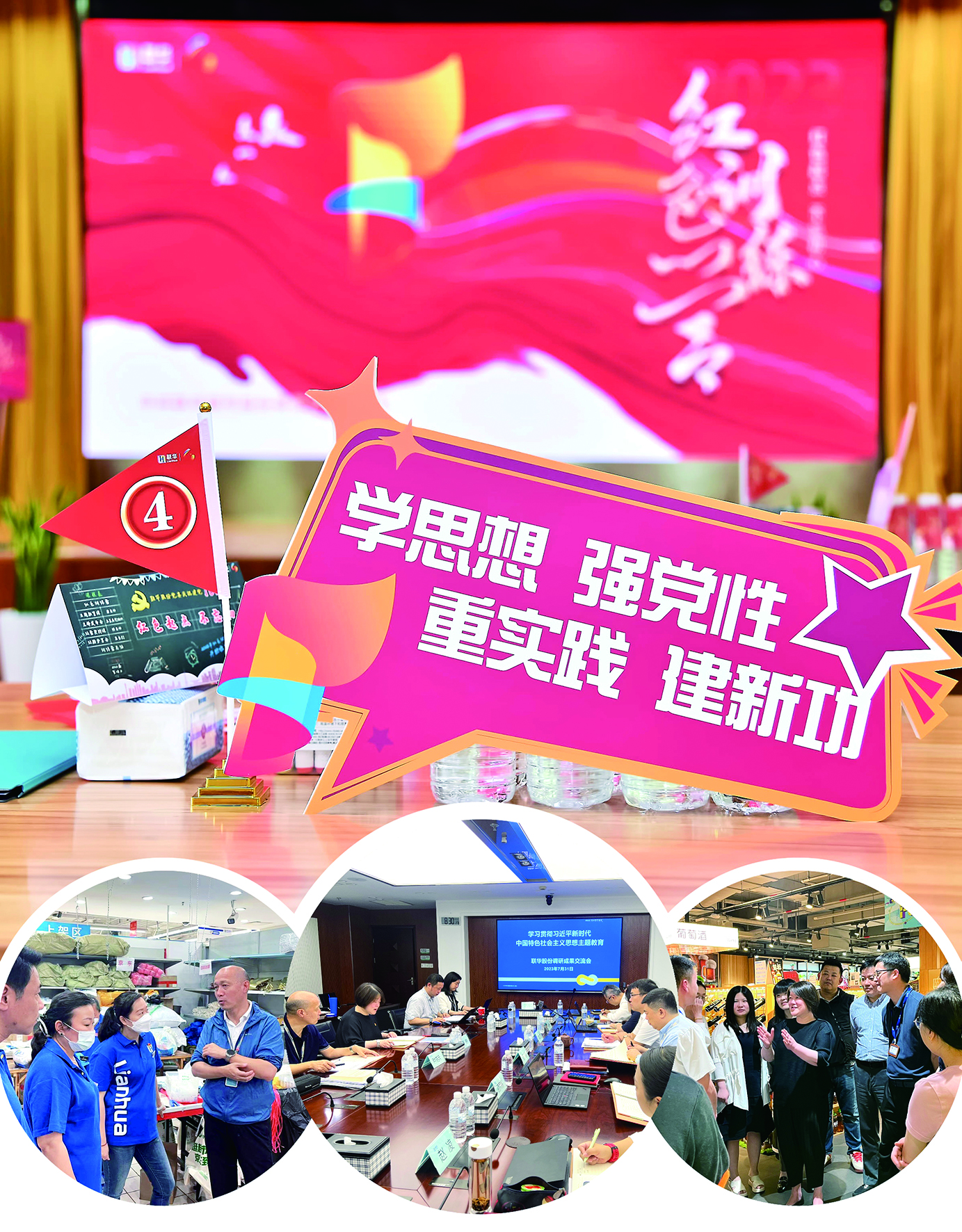 聚焦核心素养,打造思政课堂。“思政课堂”抓住主线,以同频共振为目标导向。一是订制《主题教育学习册》,落实述学制度;在联华党建开设“主题教育进行时”专栏,建立“1211”中心组理论学习模式,累计开展中心组学习11次;各基层党组织依托“三会一课”、主题党日活动载体落实基层党组织“半月谈”学习计划。实现公司党委、二级党组织和基层党支部的三级联动,使主题教育学习“入册、入脑、入心”。二是开展“征途”系列主题教育。4月份起,把集团内外丰富的红色资源作为生动教材,先后开展“南昌路的红色记忆”“中华商业第一街:上海第一面红旗升起的地方”“愚园路上共产党人的‘精神密码’”“多伦路上的英雄群体”“中国最高建筑上的云端党课”“申江潮涌——流动中的红色书卷”等专题的行走中党课学习,覆盖联华系统40个党支部、600余名党员、入党积极分子及业务骨干。7月份起,邀请市委党校马克思主义学院精品课教师卜新兵,解读党的二十大精神,开展主题教育专题讲座,与百联资产党委、上海证券党委开展主题教育专题讲座的联组学习。三是开展专题党课。班子成员中党员领导干部结合主题教育学习体会、调研情况和分管工作开展专题党课。公司党委书记唐皓以《热情奔赴光荣与梦想的征途》为主题,进行了一次融合学习感悟、互动交流、总结回顾、成果发布为一体的专题党课。