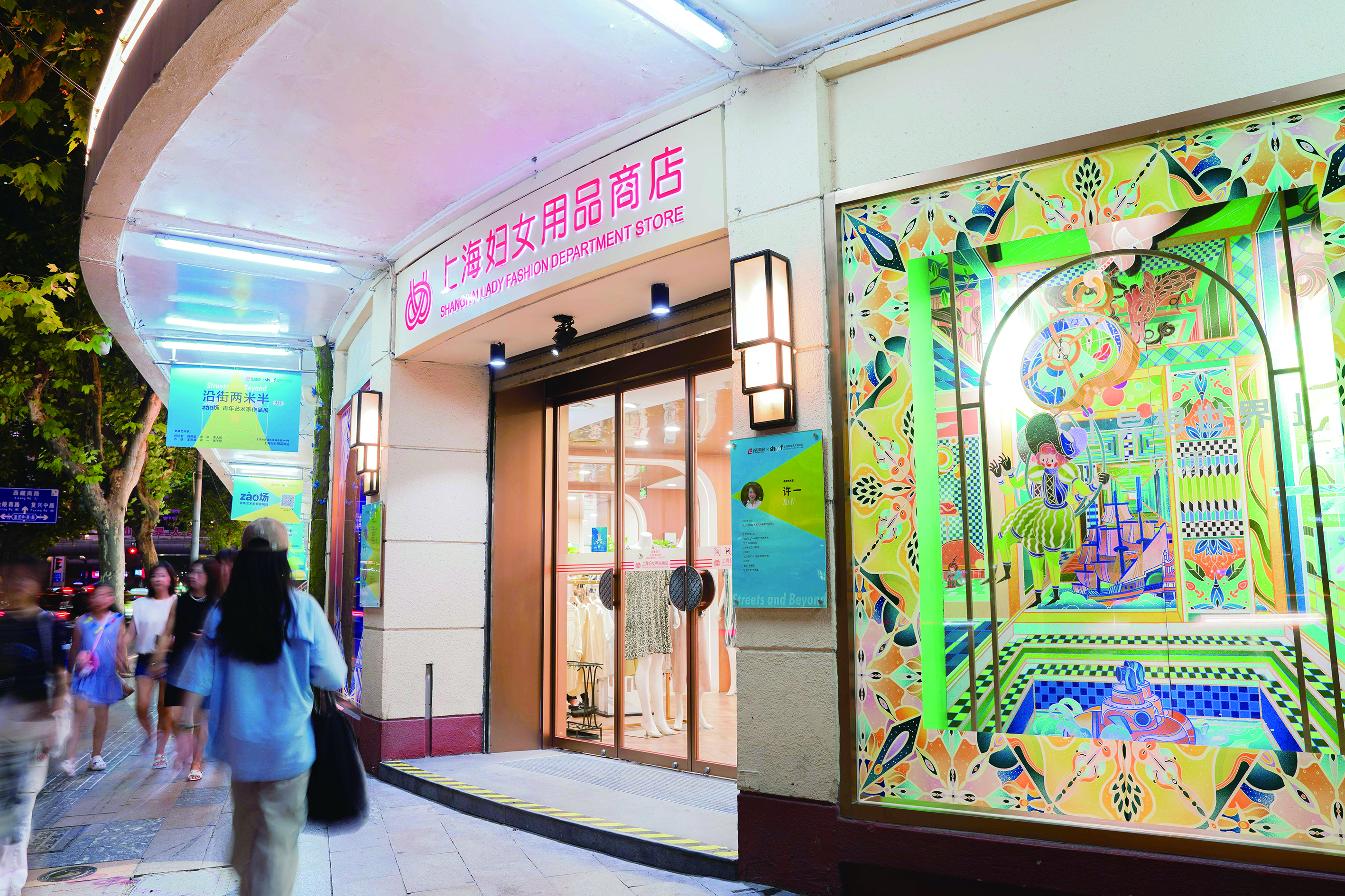 上海妇女用品商店坐落于淮海路商业街中段的培恩公寓,东依南北高架,作为淮海路上最大的Artdeco建筑,其底层商铺是街区的一大特色,沿街橱窗更是淮海中路——雁荡路口的一道风景线。“zào场”邀请青年艺术家们将商场沿街橱窗作为创作底色参与共创,使城市文脉触及当下,融入情感、思考、生活体验,与策展团队共同创造出了《弄堂记忆系列》《上海之夜》《留的荷塘听雨声》《你的童年我的童年》《异想世界》《房间里的信》《黑胶唱片机》《给你最好的礼物》等橱窗艺术作品。