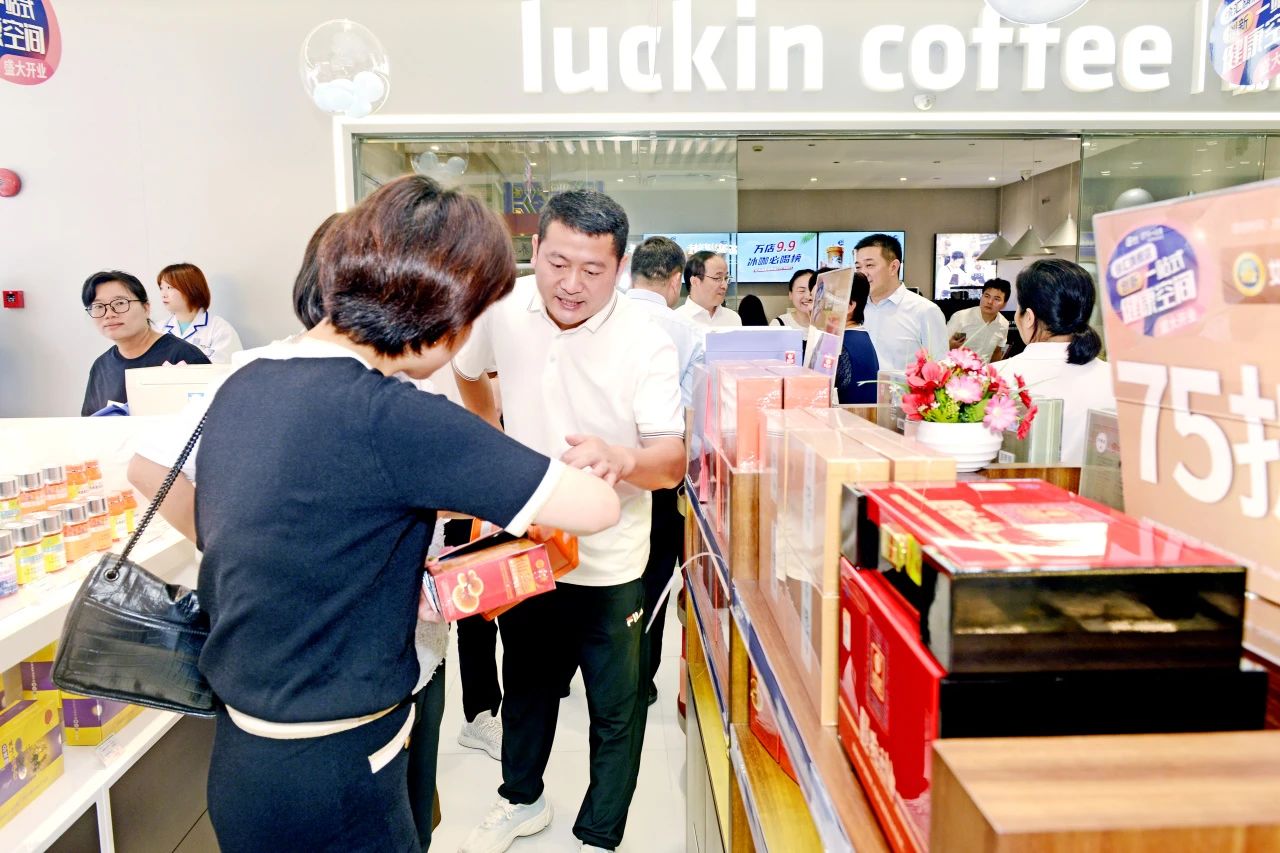 踏入第一医药徐汇区旗舰店,首先进入眼帘的是左侧瑞幸咖啡的C字形区域(Coffee),“喝着咖啡逛健康空间”是第一医药全新的跨界尝试。瑞幸咖啡的健康饮品理念与第一医药不谋而合,通过健康创新饮品吸引年轻人以咖啡取代高糖高脂的奶茶与软饮,构建更健康的生活方式。