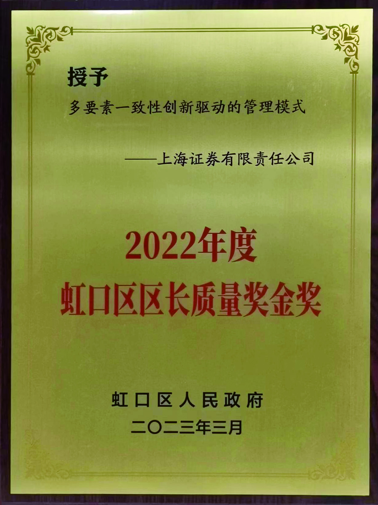 上海证券荣获“区长质量奖”金奖