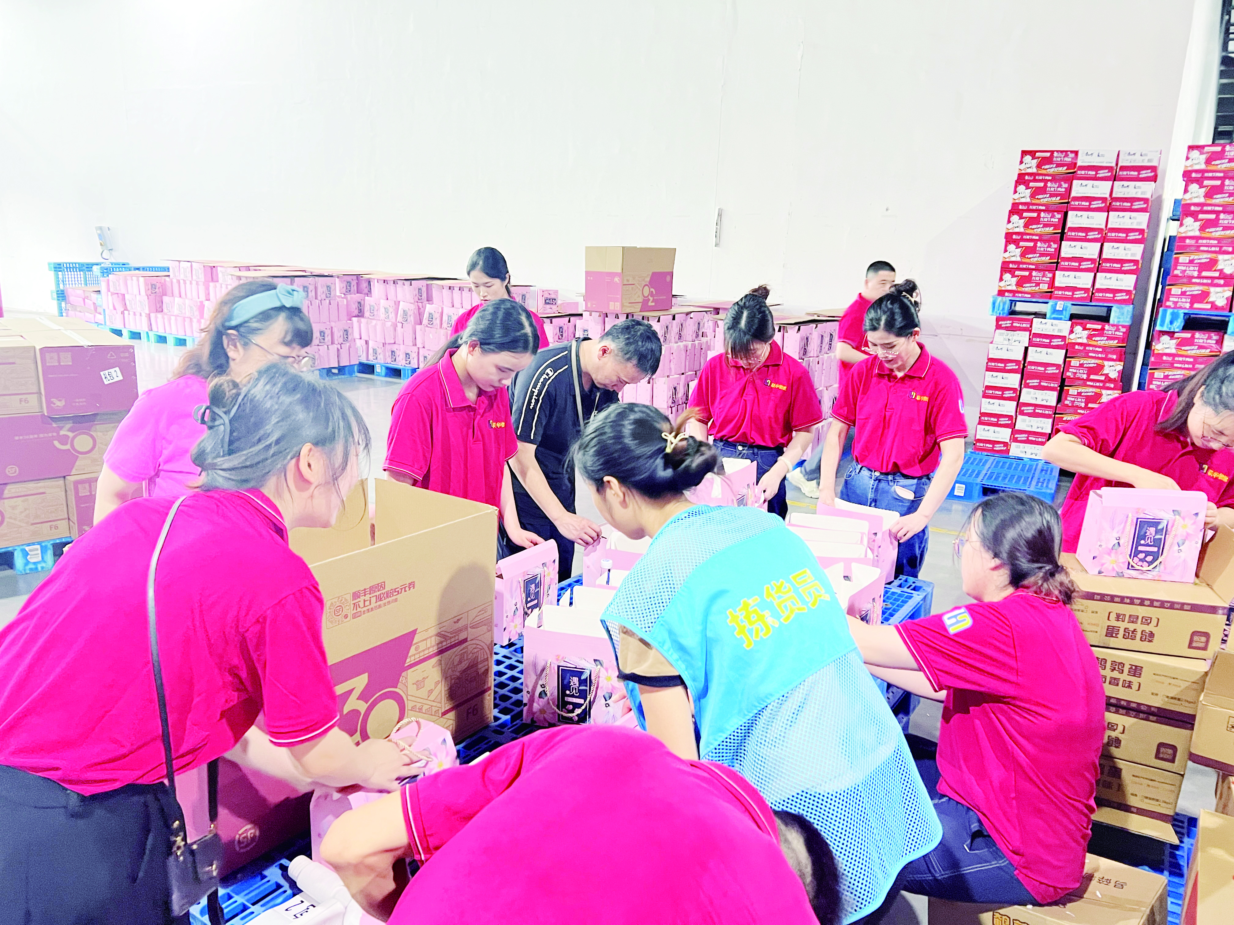 上午8点30分,亚运礼包打包攻坚战正式打响。2种礼盒,6个品项,配送至24个点位,其中最远的点位在浙江最南端——温州。为了确保礼包的品质和数量,浙江联华制定了一套完整的打包方案:全体人员分成4组,每组分设拆箱、打包、组装、贴标、搬运等岗位,确保整个打包过程井然有序。虽然30度的气温导致打包库内闷热,但是没有一个人退下来,大家顾不上休息片刻,一心只想保质保量完成工作,希望自己能为亚运盛会贡献力量。