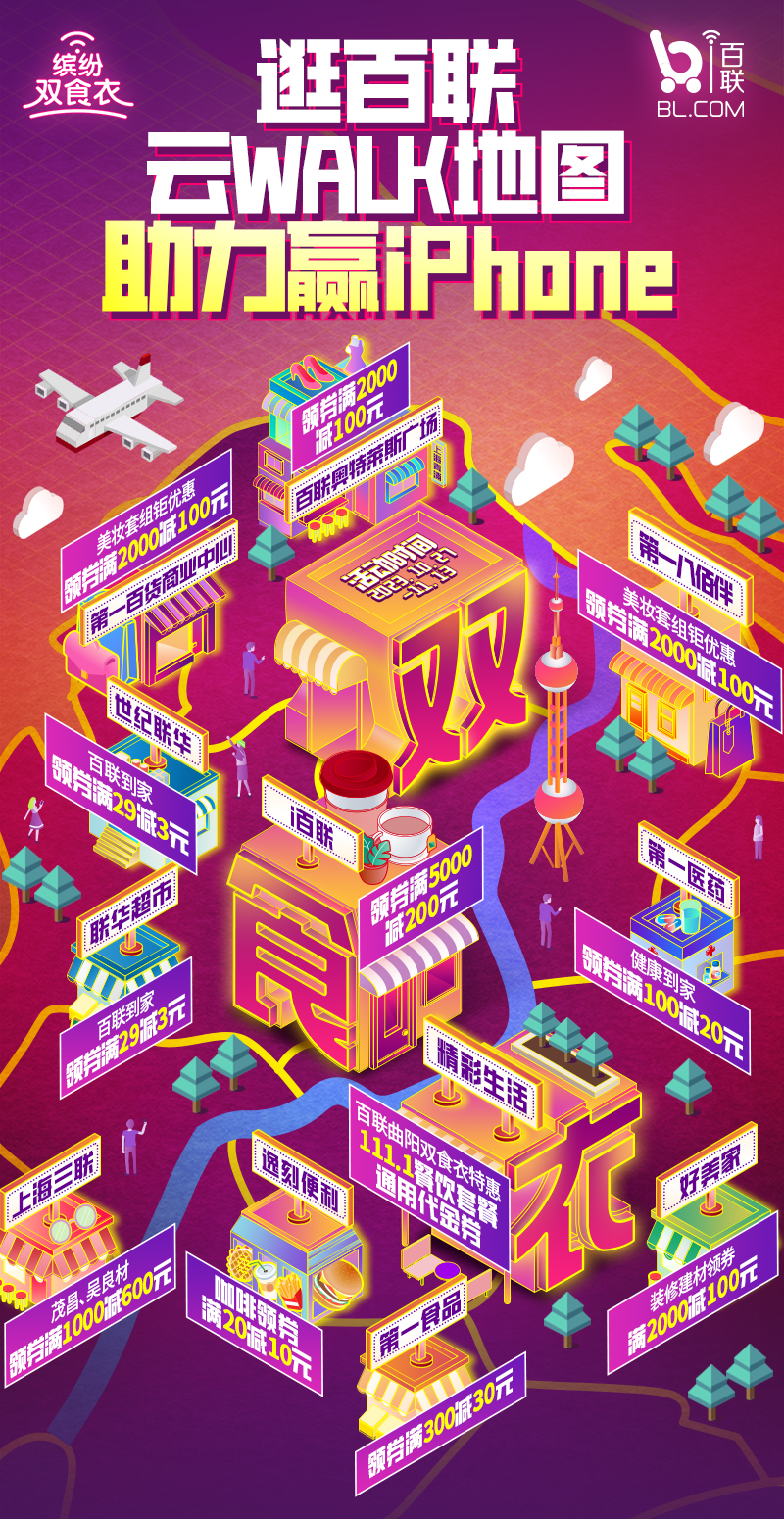 依托百联集团丰富的实体零售网络,i百联整合百联体系资源,携手百货、超市等百联旗下线下门店,通过点位串联绘制出一幅双食衣“百联云walk”地图,邀请消费者上云端体验魔都city walk。