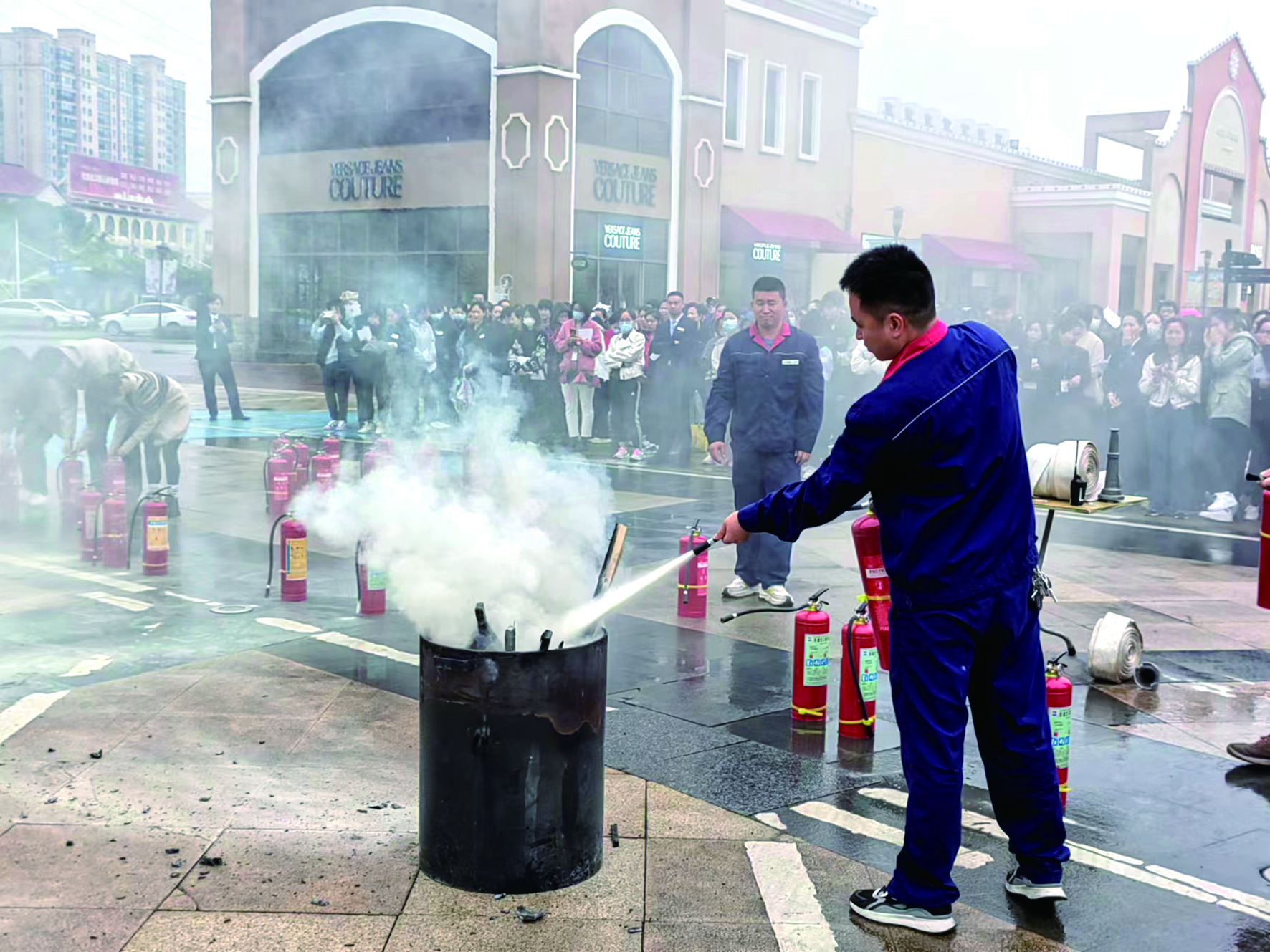 随后,横店消防救援站对参与演习的人员详细介绍了火灾类型、防火检查方法、灭火方法等基本常识和注意事项,对灭火器使用方法进行“手把手”培训,“面对面”教学,确保场内物业人员、营业员等通过讲解学习,正确掌握干粉灭火器的使用方法。广场人员也在专业人士的指导下进行实操,掌握使用技巧。