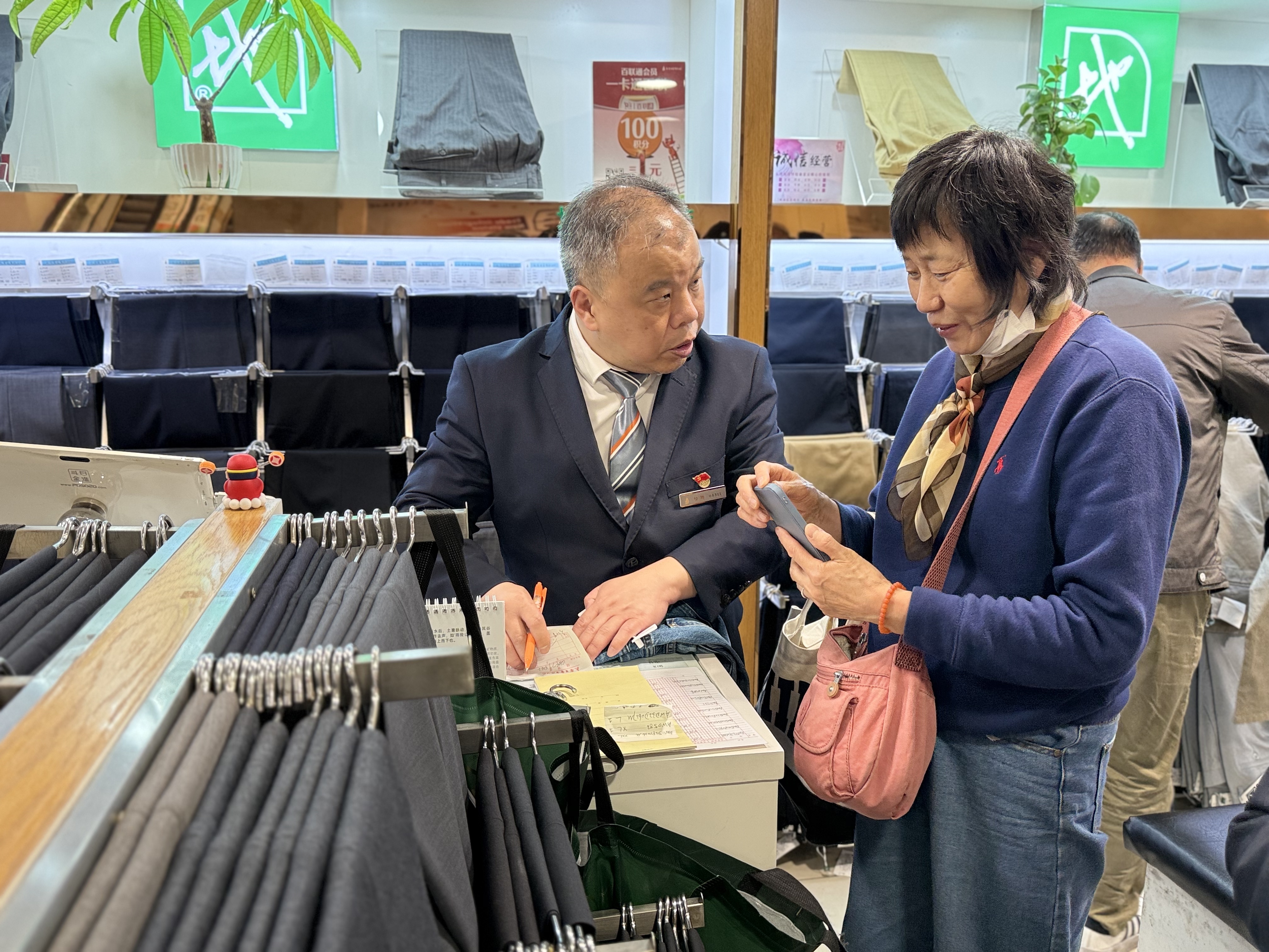 面对以老年顾客为主的消费群体,性格开朗的全轶斌迅速找到了沟通“密钥”。她操着一口地道的上海话热情招呼:“阿姨,侬看看这款阔腿裤,显瘦又舒服,阿拉店里卖得最好啦!”接地气的方言瞬间拉近距离,不少老年顾客被她的热情感染,围聚在柜台前,听她一边介绍商品,一边分享穿搭技巧,原本陌生的购物过程变得如邻里闲聊般轻松。起初连量裤腰都不会的她,现在能同时接待三位顾客,她还利用休息时间研究版型差异和搭配方法。从商场主管到服装柜台的“跨界支援”,全轶斌用行动诠释了服务的温度,她的细腻与周到更成为专柜客流不断攀升的隐形助力,也生动彰显了永安百货“顾客至上”的服务理念。