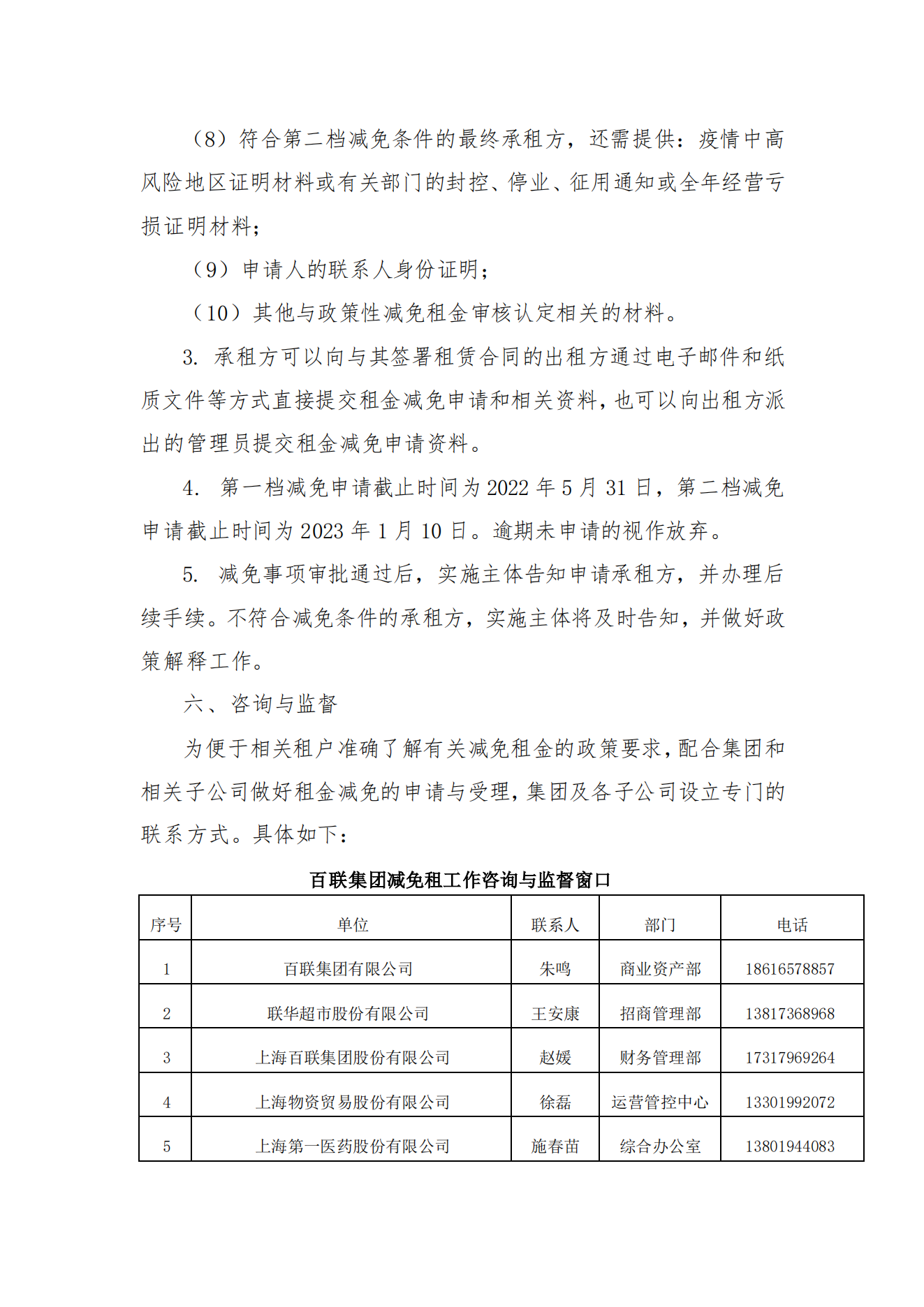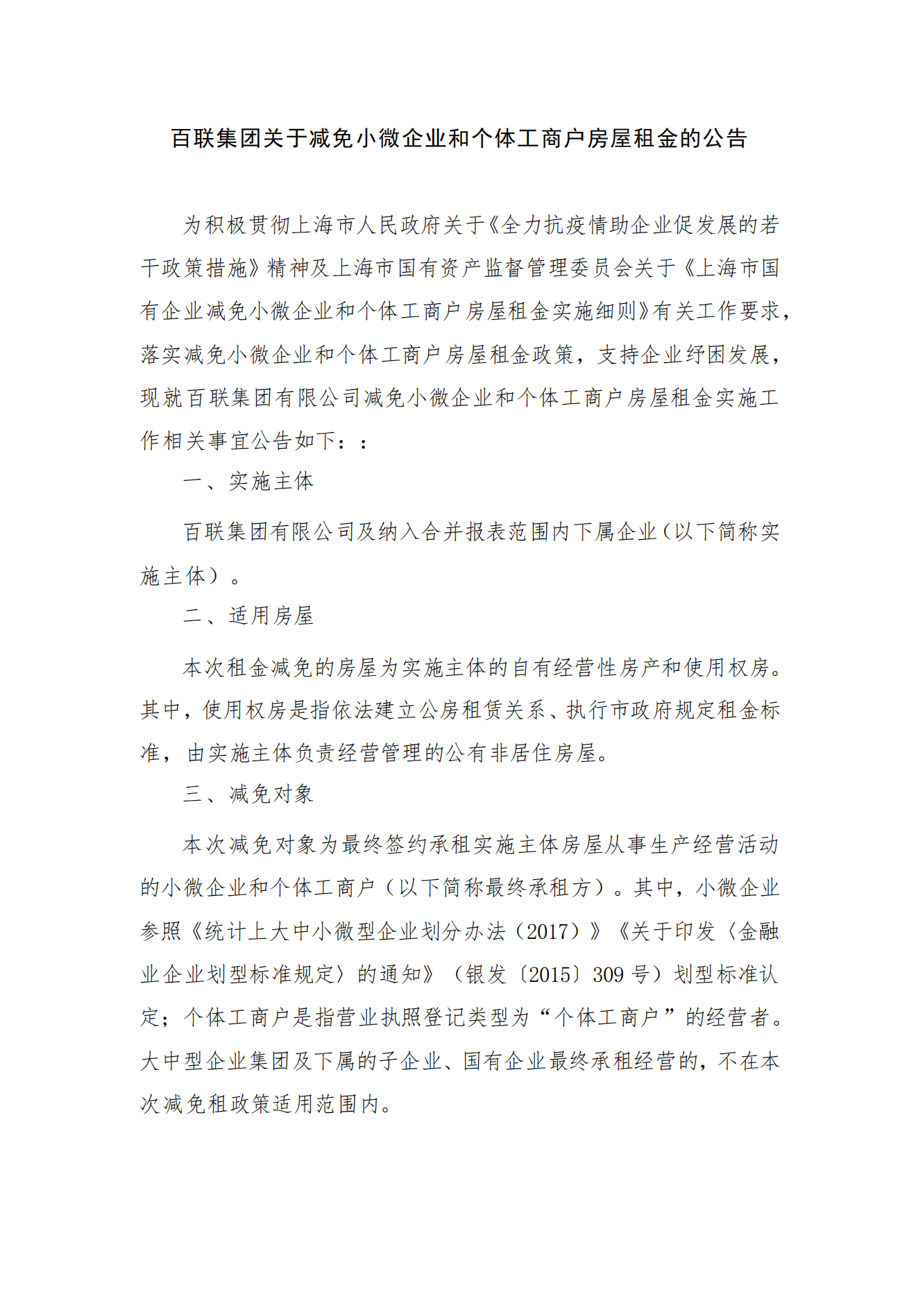 百联集团关于减免小微企业和个体工商户房屋租金的公告
