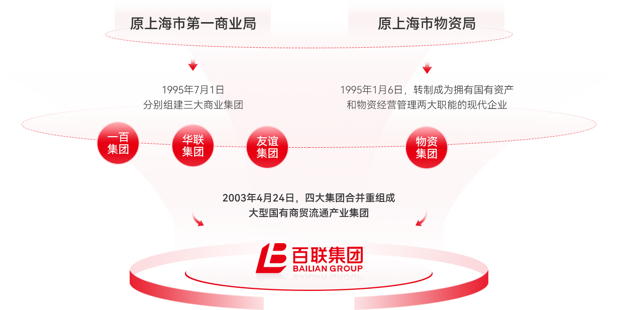 百联集团有限公司(简称“百联集团)成立于2003年4月,由原上海一百集团、华联集团、友谊集团、物资集团合并重组而成。作为深耕本土的大型国有商业产业集团,集团核心业务立足上海、发展长三角,优势业务布局全国,加快打造“以商业零售为核心,商业金融、商业资产、商业投资为支柱”的“一核三柱”新产业体系。集团整体经营规模超千亿元,总资产近 1900 亿元,净资产近 520 亿元,商业零售面积超 530 万平方米,在岗职工近 3.3 万人,下属企业近 350 家。集团控股百联股份(600827.SH、900923)、联华超市(0980.HK)、上海物贸(600822.SH、900927)、第一医药(600833.SH)等 4 家境内外上市公司。